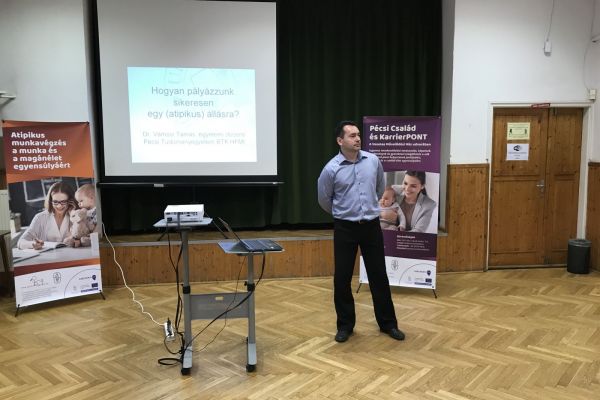 A PTE két egyetemi docense, Dr. Bankó Zoltán és Dr. Vámosi Tamás, valamint a Jobcapital munkatársa, Vári Ágnes tartott előadásokat, melyek az atipikus munkavégzés magyarországi helyzete mellett praktikus tanácsokkal is ellátták a jelen levőket. A résztvevők megismerhették az atipikus munkavégzés fő formáit, mint például a részmunkaidős foglalkoztatás, a behívás alapján történő munkavégzés, a munkakör megosztás vagy a távmunka.